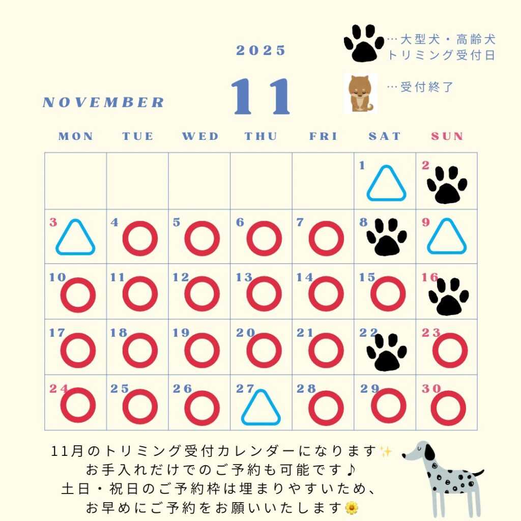 〈お知らせ〉11月のトリミング受付カレンダー 2025 10/19 お知らせ 2025年10月19日 【お店からのお知らせ】 いつも当店をご利用頂き、誠にありがとうございます。 来月のトリミング受付カレンダーになっております📅 土日祝日はご予約が埋まりやすいのでお早めにご予約下さい☑ 皆様のご来店、お待ちしております☻ ドッグサロンワンブビ お知らせ 〈お知らせ〉キャンセル料についてのお知らせ 〈お知らせ〉【ドッグランド ワンブビ情報局】~日帰り保育について~