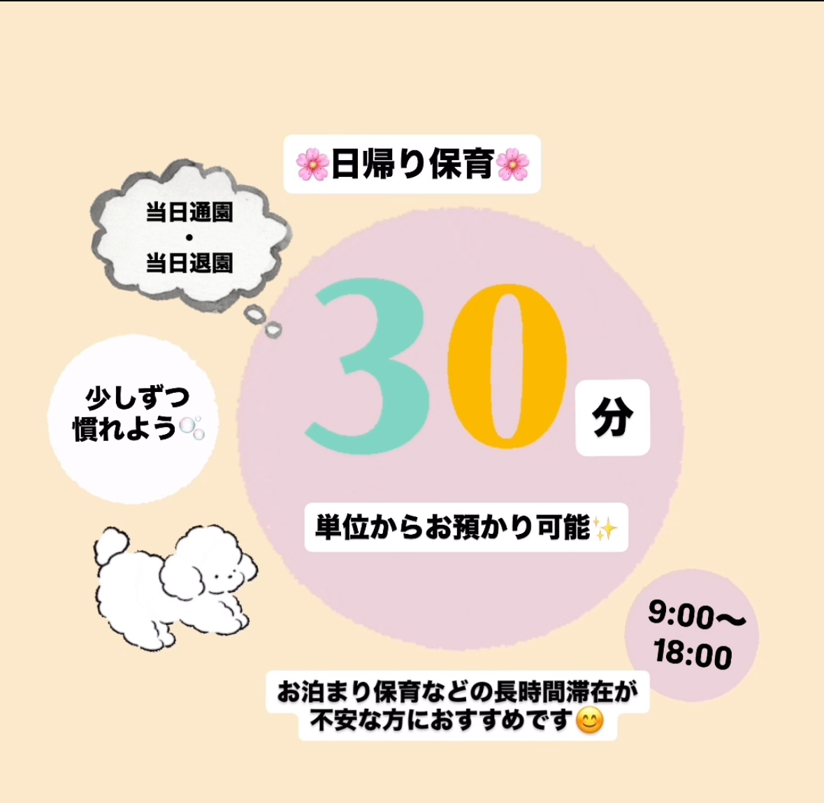 ワンブビ保育園では、『少しだけ預けたい』『お出かけの間だけ見てほしい』といったときにもお気軽にご利用頂けます☻
