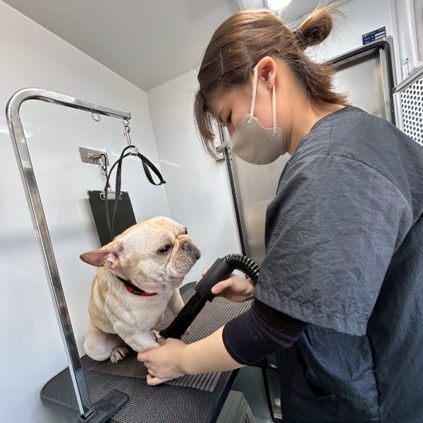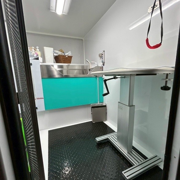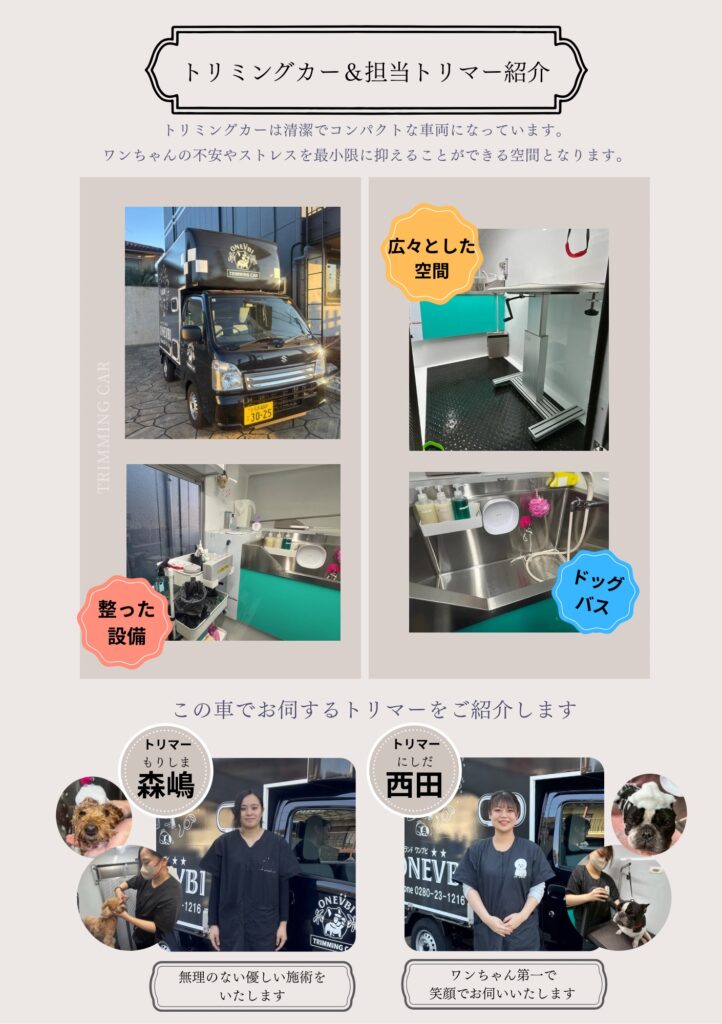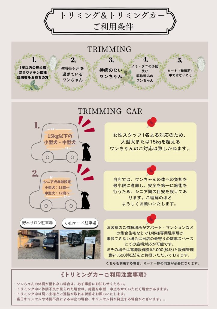 新車のトリミング専用車両で毎回トリミング終了時に使用した場所・道具の掃除や消毒を徹底しています。